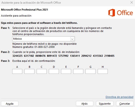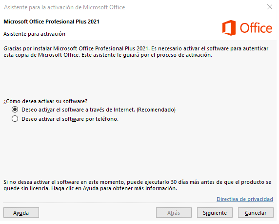 Después de esa ventana, el programa mostrara el “Asistente para la activación de Microsoft Office", si no aparece, cierre y vuelva a abrir el programa.