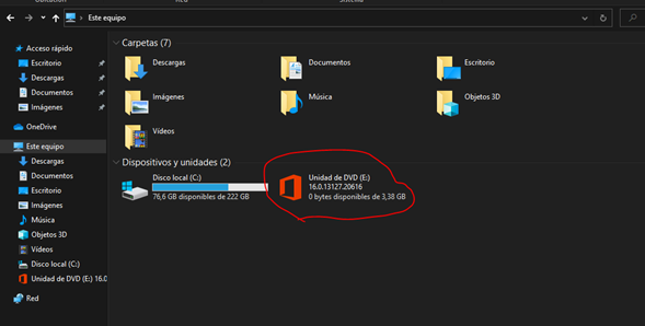 3.Debe ir a “Este equipo” y hacer clic en la “Unidad de DVD” con el logo de Office para abrir la carpeta donde está el instalador.