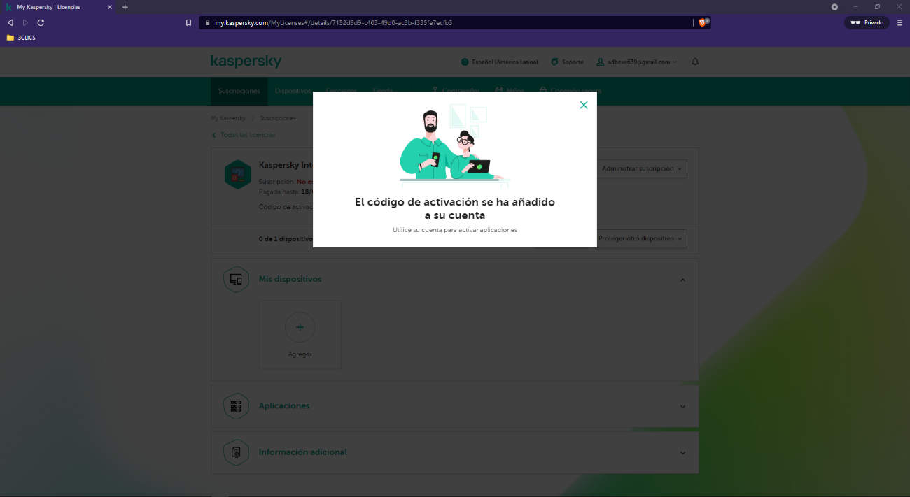 Después de escribir el código de la licencia, pinchamos el botón de agregar para que la licencia se asocie a nuestra cuenta. Si agregamos correctamente se mostrará una ventana de confirmación que indica que El código de activación se ha añadido a su cuenta.